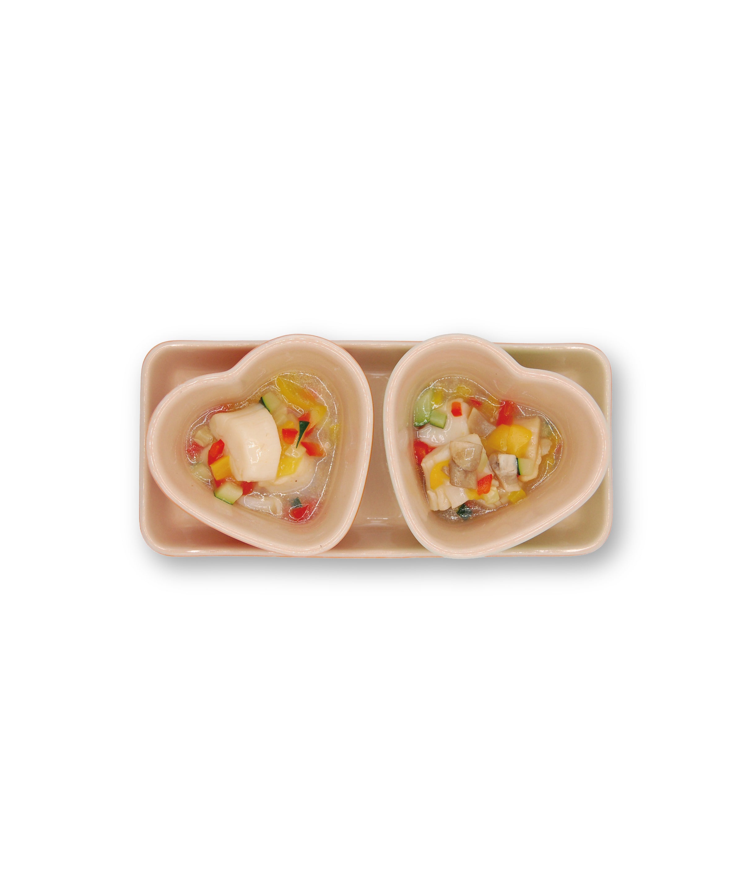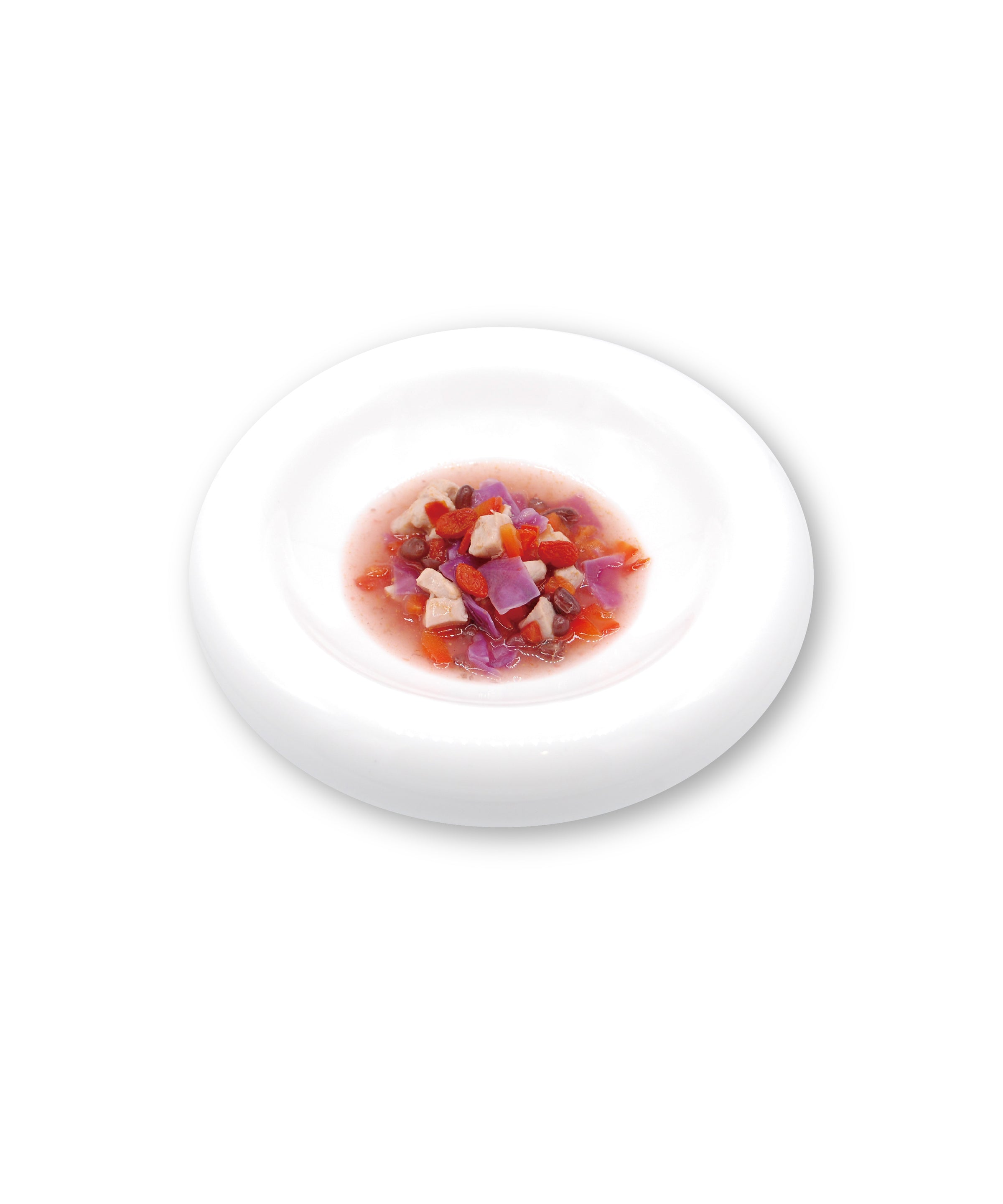 国産マグロ、紫キャベツ、赤パプリカ、プチトマト、ゆで小豆、だし汁(かつお節、昆布)、片栗粉、クコの実 |
